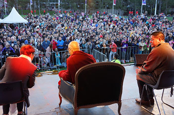 Mikey Robins put questions from the audience to His Holiness, starting by asking him what it felt like to be a Buddha. The reply was swift: