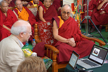 “We’ve covered a lot of ground and touched on difficult topics. We’ve enjoyed the profound implications of our two traditions. We hope our contribution has been of benefit to the monastic community. The world needs exemplars and you, Your Holiness, have worked hard to bring our two communities together. Two years ago at Stanford University you spoke of friendship, that nothing is more precious than friendship. I hope that our work and friendship will endure. I began my presentations with pictures of you in your youth with your telescope. Your gaze has broadened, but your energy is undiminished. Thank you.”