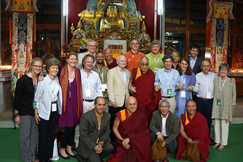 His Holiness the Dalai Lama with Mind and Life XXVI Conference participants at Drepung Monastery in Mundgod, India, on January 22, 2013. Photo/Jeremy Russell/OHHDL