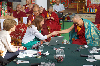 | His Holiness the Dalai Lama greeting Sona Dimidjian before her presentation at the Mind and Life XXVI conference at Drepung Monastery in Mundgod, India, on January 21, 2013. Photo/Jeremy Russell/OHHDL |