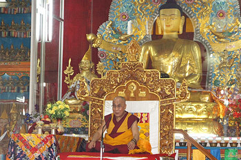 His Holiness the Dalai Lama giving some remarks during the traditional welcome ceremony on his arrival at Drepung Lachi Monastery in the Tibetan Settlement in Mundgod, Karnataka, India on 17 July 2013. Photo/Tenzin Taklha/OHHDL