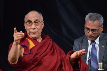 His Holiness the Dalai Lama gestures as he responds to a question from the audience during his talk at the University of Sydney in Sydney, Australia, on June 13, 2013. Photo/Rusty Stewart/DLIA 2013