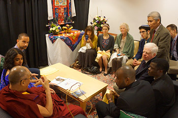 Louisville, Kentucky, USA, 20 May 2013 - Returning to the Yum Center for a second day, before beginning his morning teaching session, His Holiness the Dalai Lama met with representatives of the Dalai Lama Fellows, young people working in different parts of the world in peace, justice and ecology. Their declared aim is ‘to build a world that works for every one of us because it’s increasingly clear that, otherwise, it won’t work for any of us.’ His Holiness was impressed by their reports and supportive of their various activities. He also so had a warm conversation with Archbishop Joseph Kurtz before meeting with a group of Tibetans resident in the vicinity of Louisville. He told them: