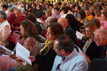 Fervent applause filled the arena when His Holiness took the stage. As it subsided, its place was taken by the plaintive tones of a cello. His Holiness paid his respects before the throne, the backdrop to which was a huge appliqué thangka depicting the Buddha, before taking his seat.