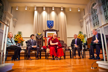 In the Glenn Memorial Auditorium, twelve hundred students and staff were gathered to listen to a dialogue between His Holiness and President James Wagner on the topic of Secular Ethics. Provost Claire Sterk made introductory remarks and Raj Patel extended a welcome to His Holiness on behalf of the student body.