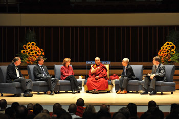 His Holiness the Dalai Lama during his dialogue with Emory President Wagner at Emory University in Atlanta, Georgia on October 9, 2013. Photo/Emory University