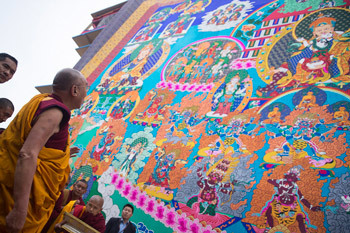 Bylakuppe, Karnataka, India, 29 December 2013 - The morning sky over Bylakuppe was mistier as His Holiness the Dalai Lama left Sera Mey Monastery this morning. On arrival at Sera Jey he was greeted by the sight of a kyigu, a huge appliqué thangka of Guru Padmasambhava hanging down the front of a building. Asked to perform a brief consecration, he recited the necessary verses and cast handfuls of rice and flower petals over the lower part of the thangka.