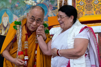 When the time came for his teaching to begin, His Holiness led her out onto the platform and introduced her to the audience. Her brief speech expressing her pleasure at coming to meet His Holiness and the great value she places on his leadership was met with warm applause.