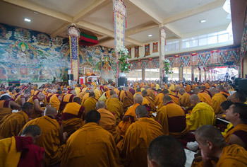 Some of the many thousands of monastics listening to His Holiness the Dalai Lama speaking at Sera Jey Monastery in Bylakuppe, Karnataka, India on December 29, 2013. Photo/Tenzin Choejor/OHHDL
