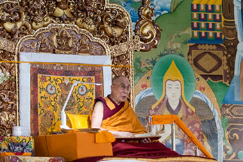 His Holiness the Dalai Lama speaking during the fifth day of his teachings at era Jey Monastery in Bylakuppe, Karnataka, India on December 29, 2013. Photo/Tenzin Choejor/OHHDL