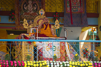 There were further crowds of Tibetans on the road near Salugara and around the gate as His Holiness arrived at Sey Gyue Monastery. He was received by the new Abbot, Akya Yongzin Rinpoche, who is also a former abbot of Gyue-mey, the Lower Tantric College. He entered the main temple and after visiting and paying his respects to the various representations of the body, speech and mind of the Buddhas, he sat down to address the senior monks. He explained that there had been plans for shorter visits to Darjeeling and Kalimpong, but because his overriding wish is to be of benefit to others, he concluded that it would be more effective to hold three days of teaching and an empowerment here instead.