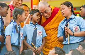 | His Holiness the Dalai Lama greets students who performed on his arrival at the teaching ground in Salugara, West Bengal, on March 27, 2013. Photo/Tenzin Choejor/OHHDL |