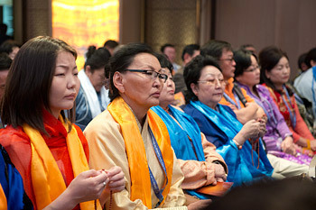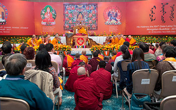 New Delhi, India, 2 December 2013 - A group of 818 Buddhists from Mongolia converged on the Kempinski Ambience Hotel in New Delhi, where they were joined by 60 Koreans and 15 Tibetans to listen to teachings by His Holiness the Dalai Lama. He was escorted from his car to a stage at one end of the hotel ballroom, which had been transformed by a large backdrop featuring a painting of the Buddha and the 17 Nalanda Masters and images of Je Tsongkhapa and Vajrabhairava. After he had taken his seat on the throne, monks led a recitation of the Heart Sutra in Mongolian.