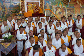 Bylakuppe, Karnataka, India, 28 December 2013 - This morning His Holiness the Dalai Lama walked briskly from his car to the teaching venue in the Sera Jey courtyard. He smiled and waved to well-wishers in the crowd, but did not stop. Once the recitation of the Heart Sutra was complete, successful Lharampa Geshe candidates received their certificates and posed in groups for photographs with His Holiness. Before the teaching began, Chairman of the Geluk International Foundation, Lama Chosphel Zotpa addressed the assembly.