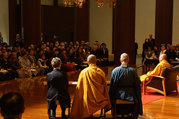 His Holiness the Dalai Lama speaking to the congregation and answering questions at the Zojoji Temple in Tokyo, Japan on November 19, 2013. Photo/Jeremy Russell/OHHDL