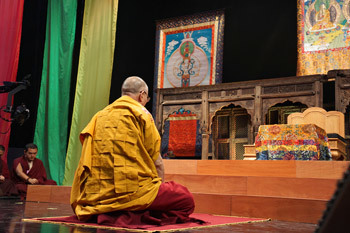 His Holiness the Dalai Lama preparing to give the ceremony for Generating the Awakening Mind before the last day of his teachings in Mexico City, Mexico on October 14, 2013. Photo/Jeremy Russell/OHHDL