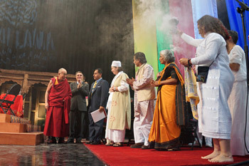Returning to the Arena His Holiness met members of a number of different faiths who were seated with him on the stage. The Arena was filled to capacity, 12,000 people cheered and applauded him in welcome. Tickets for the event were free and had been distributed to students with options to invite their teachers, parents and friends to join them for His Holiness’s talk.