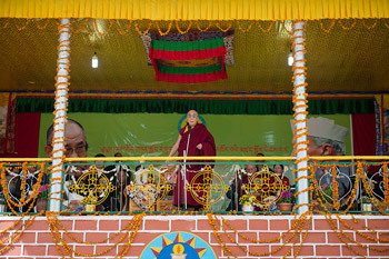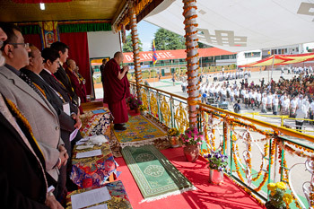 Dalhousie, Himachal Pradesh, India, 28 April 2013 - His Holiness the Dalai Lama was escorted from his car to the stage at the Central School for Tibetans, Dalhousie, this morning, sheltered from the sun by a ceremonial umbrella. With folded hands he greeted all who had come to attend the school’s 50th anniversary celebrations and took his seat.