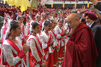 A short drive down the hill took His Holiness to the gates of the Dalhousie Public School (DPS), an institution with 1000 residential students, from Kindergarten to Class 10. They were joined by students from other schools nearby, such as the Sacred Heart School and the Guru Nanak Public School. Events began with an elaborate dance by boys and girls of the DPS expressing the timeless Indian greeting, “Namaskar .” Introducing His Holiness to the students, the Principal of the DPS said that his presence made it a ‘red-letter day.’