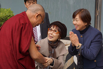 His Holiness the Dalai Lama is greeted by well-wishers on his arrival at the airport in Narita, Japan on November 15, 2013. Photo/Jeremy Russell/OHHDL