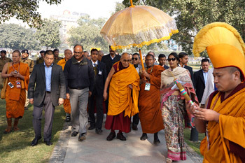 | His Holiness the Dalai Lama arriving at Buddha Smriti Park to attend the International Buddhist Sangha Conference in Patna, Bihar, India, on January 5, 2012. Photo/Jeremy Russell/OHHDL |