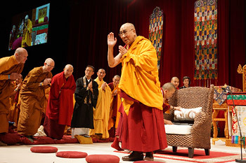 After noting that the first verse was a salutation to the Buddha, Dharma and Sangha, he remarked on the importance of knowing what those words mean and what it means to take refuge in them. As he has done elsewhere, His Holiness urged his listeners to be 21st century Buddhists, suggesting that their practice be built not only on faith, but on understanding and reason.
