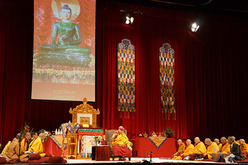 At the Sydney Entertainment Centre, after the customary salutations, His Holiness took his seat in an armchair near the front of the stage. He was surrounded by monks and nuns of several Buddhist traditions. At his instruction the Mangala Sutta was recited first in Pali, followed by the Heart Sutra in Chinese and a short verse in Tibetan.