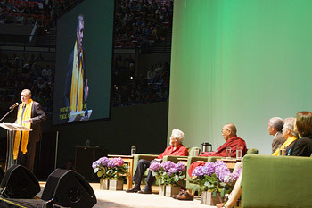 Oregon Governor John Kitzhaber introduces His Holiness the Dalai Lama and panelists at the start of the environmental summit on "Universal Responsibility and the Global Environment" at Veterans Memorial Coliseum in Portland, Oregon on May 11, 2013. Photo/Jeremy Russell/OHHDL