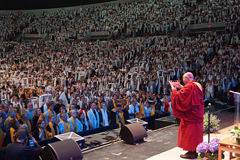 His Holiness the Dalai Lama acknowledging the 11,000 members of the audience wearing white silk scarves at the end of his talk at Veterans Memorial Coliseum in Portland, Oregon on May 11, 2013. Photo/Jeremy Russell/OHHDL