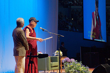 Governor Kitzhaber invited the panellists to lunch in the company of two Oregon Senators and the Mayor of Portland. In the afternoon, Congressman Earl Blumenauer introduced His Holiness to the audience of nearly 11,000 people. His Holiness began as he does so often: