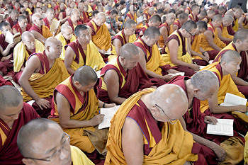On the last day of his visit to Rabgyaling Settlement in Hunsur, the Dalai Lama conferred a long life empowerment to the resident monks of Gyumed Tantric University and Tibetans who came from the surrounding Tibetan settlements.