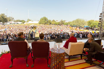 His Holiness the Dalai Lama speaking to a crowd of over 6,000 near the Fox Center in Guanajuato, Mexico on October 15, 2013. Photo/Oscar Fernandez