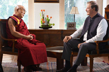 Former Mexican President Vincente Fox interviewing His Holiness the Dalai Lama for his television show on TV Azteca in at the Fox Center in Guanajuato, Mexico on October 15, 2013. Photo/Jeremy Russell/OHHDL