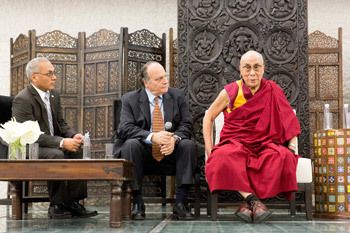 León, Guanajuato, Mexico 15 October 2013 - This morning as the day began to warm, His Holiness the Dalai Lama’s hosts at Hacienda San Cristoboal, former Mexican President Vicente Fox and his wife came to see him. They met privately for a few minutes before walking with him from the main house to the newly established Vicente Fox Center of Studies, Library and Museum. This modern facility which incorporates a library, museum, a centre for the advancement of democracy, and is privately funded will be Mexico’s first US style presidential library. President Fox was pleased to point out how the new buildings blend in with the old ones that have been in his family for more than one hundred years.