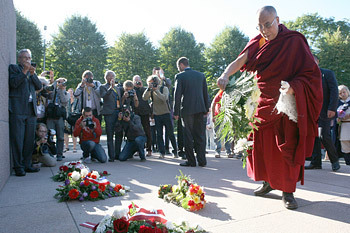 His Holiness the Dalai Lama lays flowers at the foot of the Freedom Monument in Riga, Latvia on September 9, 2013. Photo/Igor/SaveTibetRussia