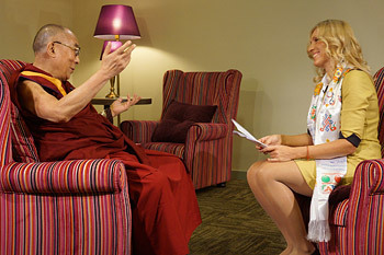 His Holiness the Dalai Lama being interviewed for Latvian Television during his visit to Riga, Latvia on September 9, 2013. Photo/Jeremy Russell/OHHDL
