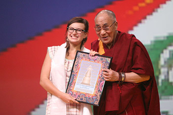 His Holiness the Dalai Lama presenting Tereze Telpe with the Dalai Lama Award for Youth Compassion at the start of his talk in Riga, Latvia on September 9, 2013. Photo/Igor/SaveTibetRussia