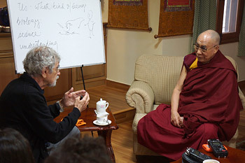 Today, Dr Maturana wanted to talk about what kind of beings we are in terms of biology, science and understanding. He said that when we investigate, we find we are living beings. We find ourselves living in families, in communities and acting together. We also have language to coordinate our actions and feelings, but when we look to see what we are made of, we find the answer is molecules. His Holiness interjected that plants and trees also consist of molecules like us and yet they have no language; why? He further asked what the difference is between plants and mammals with no language and Dr Maturana replied that the difference lies in their manner of living. He added that as far as we know only human beings have language. As the conversation turned to emotions, His Holiness pointed out that emotions are not necessarily connected with the use of language. To His Holiness’s question whether the mind is a separate entity, Dr Maturana replied that it is not, but it exists in relation to the brain, which prompted His Holiness to recall another scientific friend, Wolf Singer’s observation that there seems to be no central control of the brain.