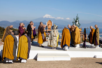 Shizuoka, Japan, 22 November 2013 - When Mt Fuji was added to the World Heritage List as a cultural site in June this year it prompted another exciting idea.  Save Tibet Network in conjunction with the Liaison Office of His Holiness the Dalai Lama for Japan and East Asia decided to convene an interfaith meeting focussed on world peace in the vicinity. In his introduction to the occasion today, Chairman of the Organizing Committee, Seishu Makino said that while it limited the size of event they could hold, the choice of Nihondaira as the location, in full view of Mt Fuji was an inspiration. The very name Nihondaira means ‘to pacify Japan’, making it an appropriate place to pray for peace in the world and Mt Fuji has been an object of pilgrimage for centuries. As everyone attending the gathering today witnessed for themselves, it is uplifting simply to gaze at its snow-capped cone aloft in the clear blue sky.