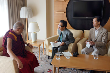 His Holiness the Dalai Lama in conversation with journalists from fashion and beauty magazine Anan in Kyoto, Japan on November 24, 2013. Photo/Jeremy Russell/OHHDL