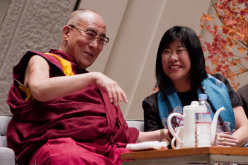 His Holiness the Dalai Lama and writer Banana Yoshimoto during their conversation at the Kyoto International Conference Centre in Kyoto, Japan on November 24, 2013.