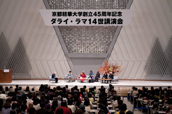 At the Kyoto International Conference Centre after lunch, His Holiness was joined for a conversation about the ‘Potential for Modes of Expression to Bring Freedom to the World’ by well-known writer, Banana Yoshimoto. After the University President, Shigeaki Tsubouchi, had opened proceedings, Ms Yoshimoto read a short prepared presentation. She said she was nervous to be sitting there able to speak to His Holiness. She also admitted having been his supporter for some time and hoped that members of the younger generation would continue this. She said it was His Holiness’s flexibility of thought that impressed her.