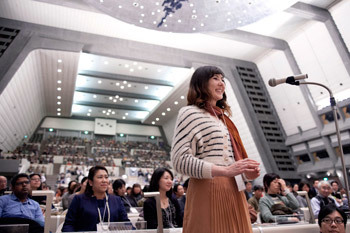 An audience member asking His Holiness the Dalai Lama a question during his conversation at the Kyoto International Conference Centre in Kyoto, Japan on November 24, 2013. Photo/Office of Tibet, Japan