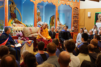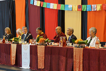 Portland, Oregon, USA, 10 May 2013 - Maitripa College is a Tibetan Buddhist College founded in 2005 in Portland, Oregon. Since 2008, it has been able to award degrees and today His Holiness the Dalai Lama was the special guest during such a commencement ceremony. The sunlit streets outside were filled with well-wishers who waved and called out to His Holiness as he was met at the door by founding President Yangsi Rinpoche. Escorted briskly around the college, he was shown the various facilities before entering the Jokhang or main hall where he viewed the sacred images and paid his respects before taking his seat. Oregon Office of Degree Authorization representative Jennifer Diallo gave a short welcoming talk in which she introduced Maitripa College and explained the criteria for proper authorization of degrees.