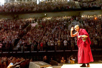 His Holiness the Dalai Lama waving to the audience of over 10,000 people at University of Oregon's Matthew Knight Arena in Eugene, Oregon on May 10, 2013. Photo/Kurt Smith