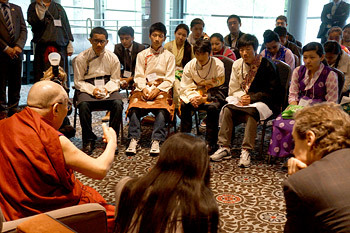 | His Holiness the Dalai Lama meeting with Tibetan staff and students participating in the Global Leadership Initiative in Portland, Oregon, on May 8, 2013. Photo/Jeremy Russell/OHHDL |