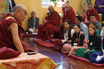 Madison, Wisconsin and New Orleans, Louisiana, USA, 16 May 2013 - On his last morning at Deer Park, Madison, as the early sun caught the new leaves on the trees and peacock calls rang through the woods behind the temple and Kalachakra Pavilion, His Holiness met privately with a group of Chinese and afterwards with a group of Tibetan students studying in the USA.
