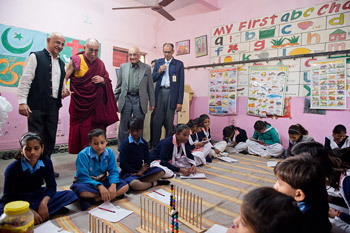 Harsh Mander and His Holiness the Dalai Lama visiting a classroom at the Care Home for Street Children in Mehrauli, New Delhi, India on December 7, 2013. Photo/Tenzin Choejor/OHHDL