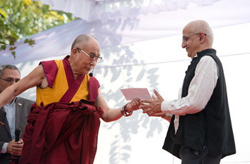 His Holiness the Dalai Lama presenting a donation to Harsh Mander to help the Care Home for Street Children in Mehrauli, New Delhi, India on December 7, 2013. Photo/Tenzin Choejor/OHHDL