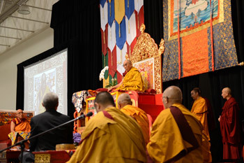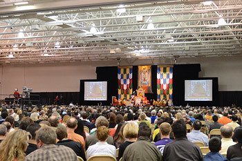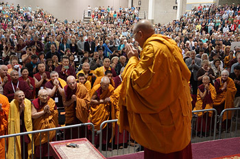 Madison, Wisconsin, USA, 14 May 2013 - Having been given a better than clean bill of health by his doctors in Rochester, His Holiness the Dalai Lama was accorded a traditional Tibetan welcome on arrival yesterday at Deer Park, the Buddhist Center founded by Geshe Lhundup Sopa near Madison, Wisconsin. On this his ninth visit to Madison, Geshe Sopa and Deer Park requested His Holiness the Dalai Lama to give a public teaching. Consequently, this morning, he came to the Alliant Energy Center in Madison, where every seat was full and 3500 people were gathered to hear him. He was introduced to the audience by Zorba Paster, who thanked Geshe Sopa for inspiring the invitation and everyone who contributed to making the event possible.